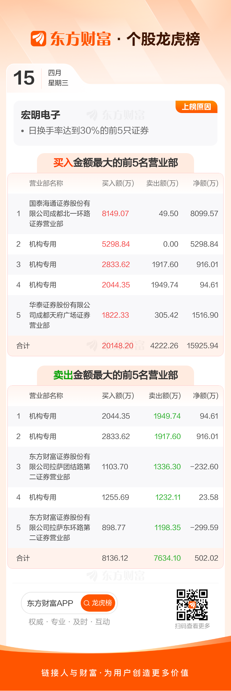 交易所2026年4月15日公布的交易公开信息显示,宏明电子因成为日换手率达到30%的前5只证券上榜。宏明电子当日收报125.71元,涨跌幅7.60%,偏离值39.12%,换手率39.12%,成交额12.86亿。
