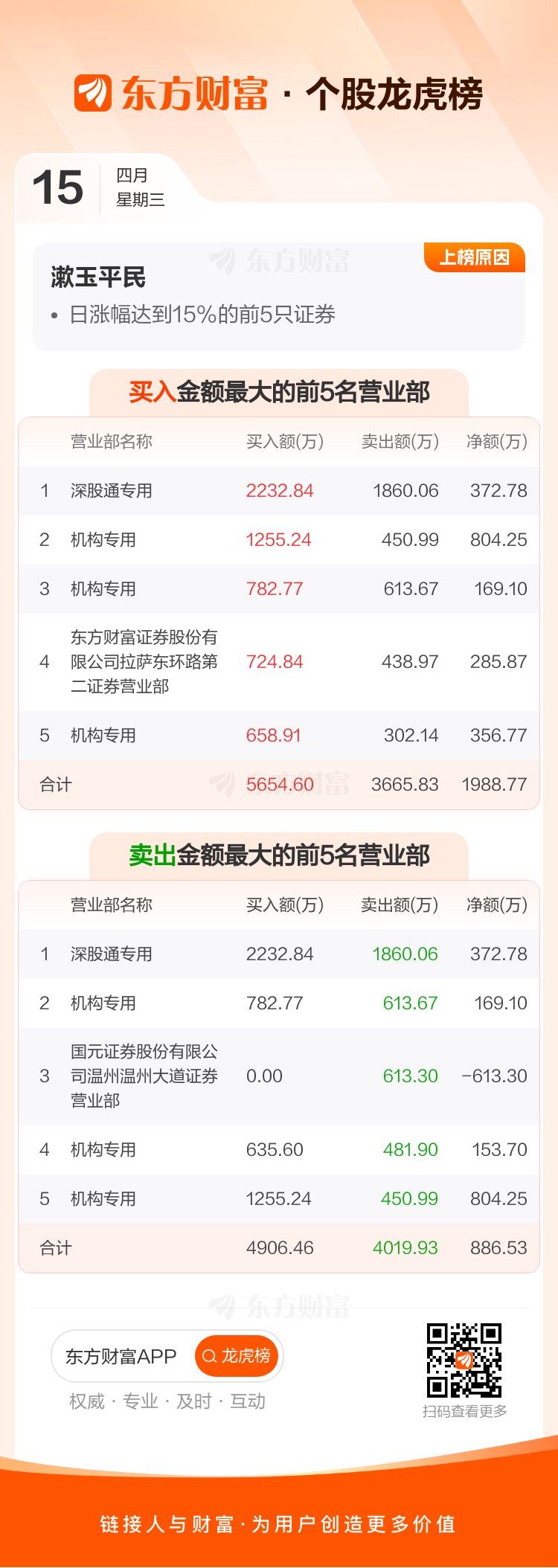交易所2026年4月15日公布的交易公开信息显示,漱玉平民因成为日涨幅达到15%的前5只证券上榜。漱玉平民当日收报16.28元,涨跌幅15.79%,偏离值15.79%,换手率14.53%,成交额5.79亿。