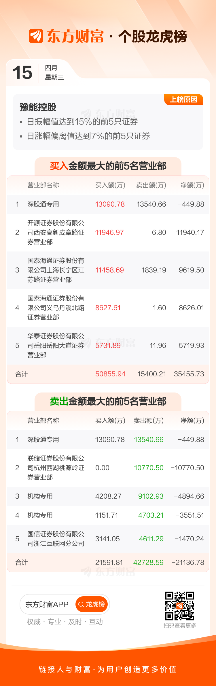 交易所2026年4月15日公布的交易公开信息显示,豫能控股因成为日涨幅偏离值达到7%的前5只证券、日振幅值达到15%的前5只证券、连续三个交易日内,涨幅偏离值累计达到20%的证券上榜。豫能控股当日收报16.57元,涨跌幅10.03%,偏离值10.71%,换手率17.45%,成交额42.20亿。异常期间4月13日至4月15日,期间涨幅25.44%,累计偏离值24.19%,区间成交额96.22亿。