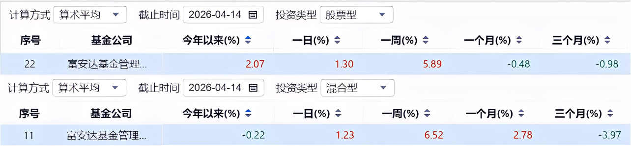 同花顺数据显示,截至4月14日(下同),股票型基金与混合型基金的整体平均收益率(算术平均)分别为4.38%与5.11%;而富安达基金今年以来股票型基金的整体平均收益率为2.07%,混合型基金的收益率为-0.22%。具体来看,公司旗下28只基金中有8只年内收益为负(仅统计A份额);有18只产品跑输同期基准收益率,基本为权益产品。