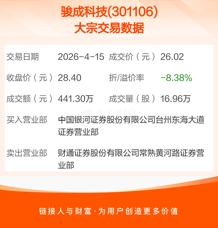 2026年4月15日,骏成科技发生1笔大宗交易,共成交16.96万股,成交金额441.30万元,占其流通市值比例为0.15%。