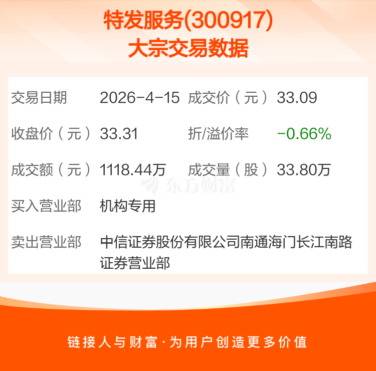 2026年4月15日,特发服务发生1笔大宗交易,共成交33.80万股,成交金额1118.44万元,占其流通市值比例为0.20%。