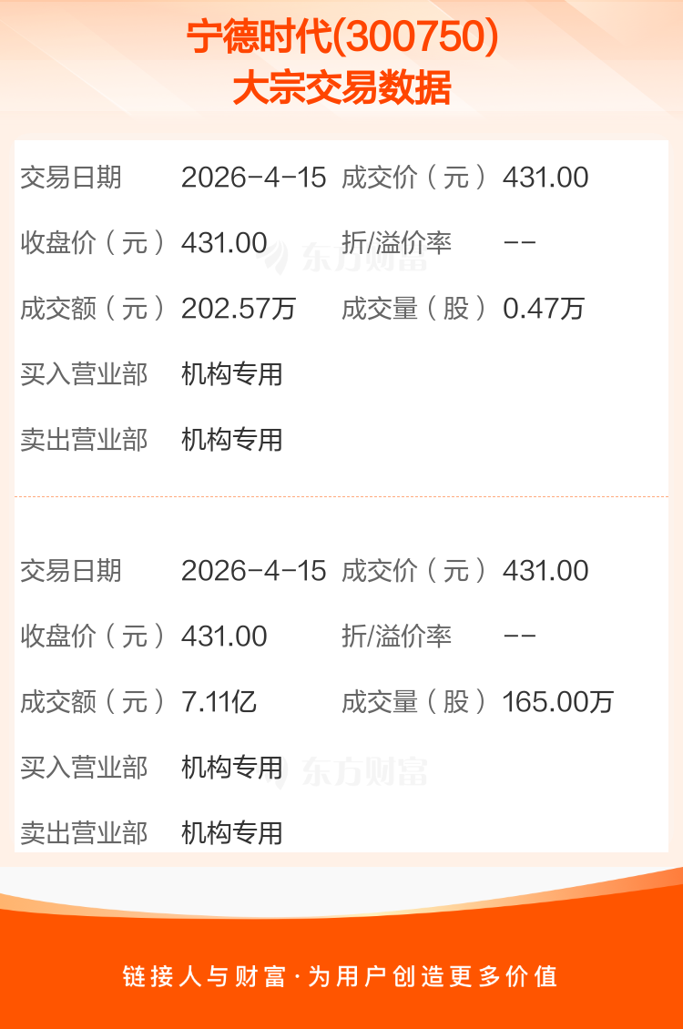 2026年4月15日,宁德时代发生2笔大宗交易,共成交165.47万股,成交金额7.13亿元,占其流通市值比例为0.04%。