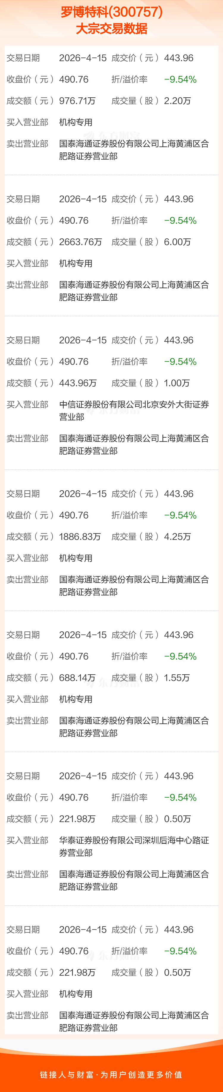 2026年4月15日,罗博特科发生7笔大宗交易,共成交16.00万股,成交金额7103.36万元,占其流通市值比例为0.10%。
