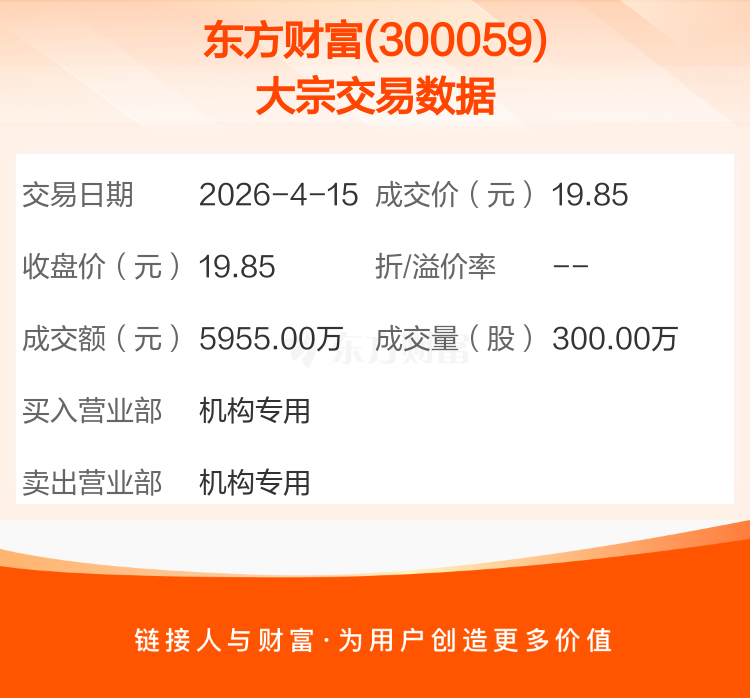 2026年4月15日,东方财富发生1笔大宗交易,共成交300.00万股,成交金额5955.00万元,占其流通市值比例为0.02%。