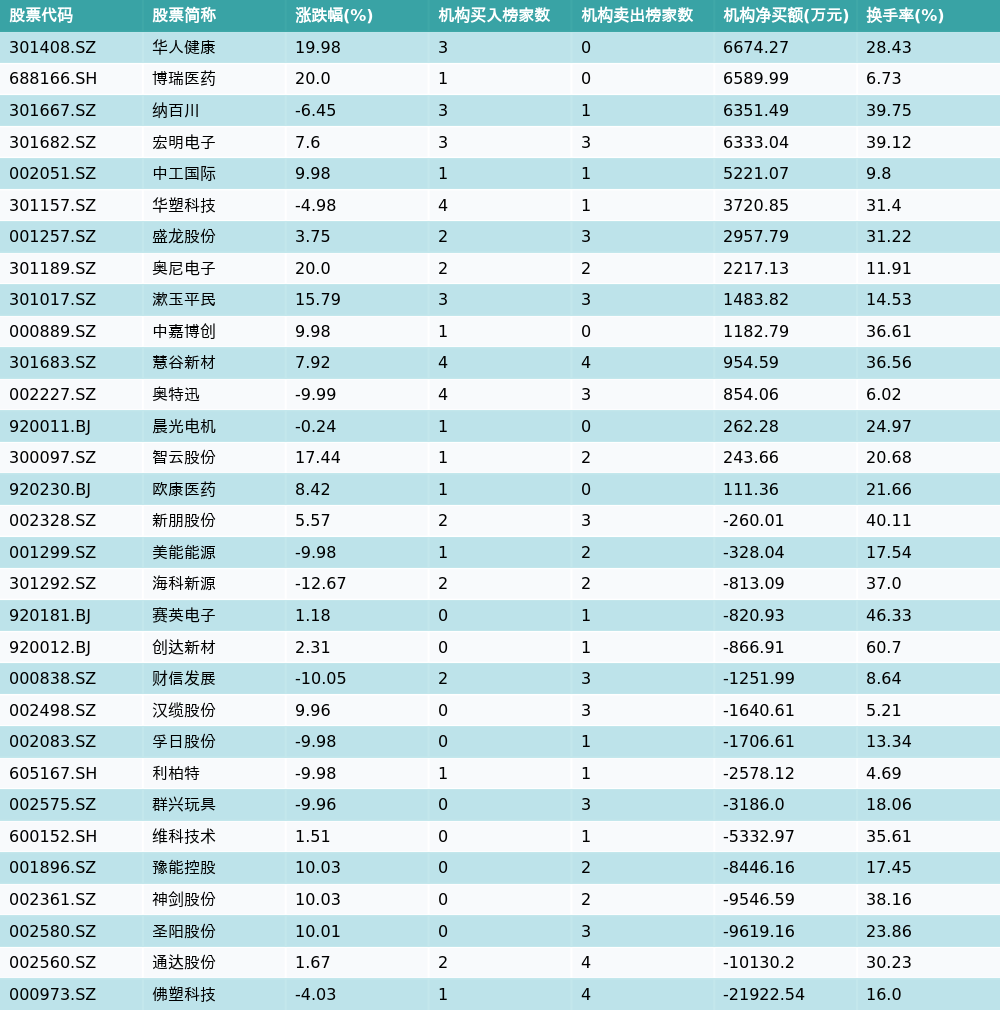 南财智讯4月15日电,盘后数据显示,因当日异动登上龙虎榜的个股中,31只沪深A股龙虎榜出现了机构的身影,机构合计净卖出33291.74万元,具体来看,机构净买入15只个股,净卖出16只个股。其中,机构净买入前三分别为华人健康(301408.SZ)、博瑞医药(688166.SH)与纳百川(301667.SZ),详情见下图:机构净卖出的个股中,前三分别为佛塑科技(000973.SZ)、通达股份(002560.SZ)与圣阳股份(002580.SZ)。