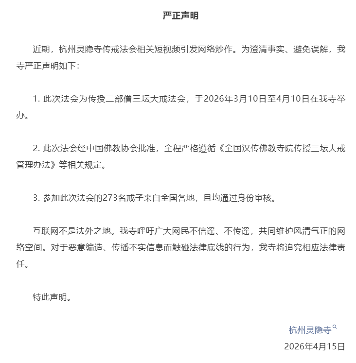 互联网不是法外之地。灵隐寺呼吁广大网民不信谣、不传谣,共同维护风清气正的网络空间。对于恶意编造、传播不实信息而触碰法律底线的行为,灵隐寺将追究相应法律责任。