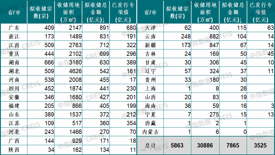 具体到各个省市,截至3月31日,广东、浙江、江西、重庆、湖南、湖北、河南、四川、安徽、福建的拟收储总金额居于前十,分别为891亿元、831亿元、712亿元、699亿元、630亿元、542亿元、455亿元、441亿元、427亿元、405亿元。