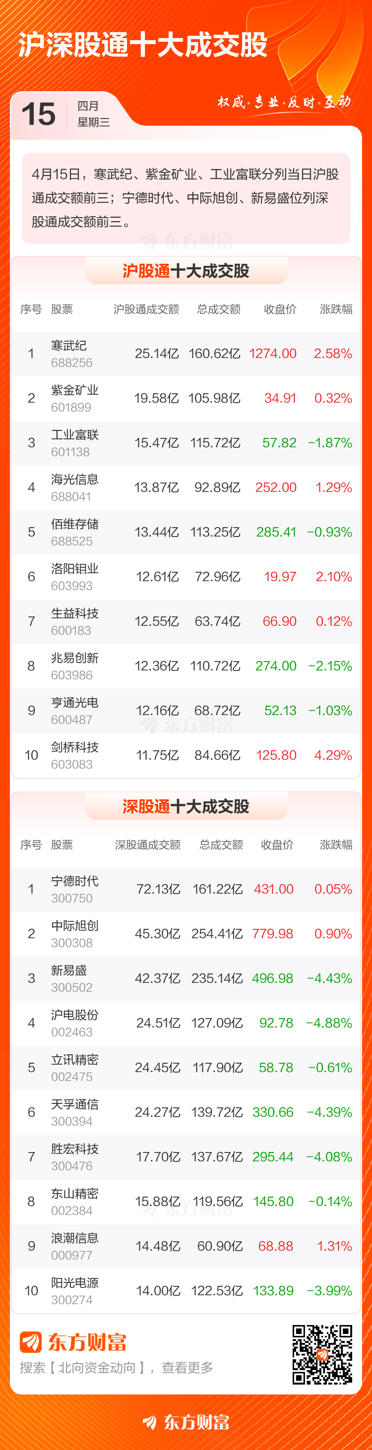 4月15日北向资金最新动向(附十大成交股)