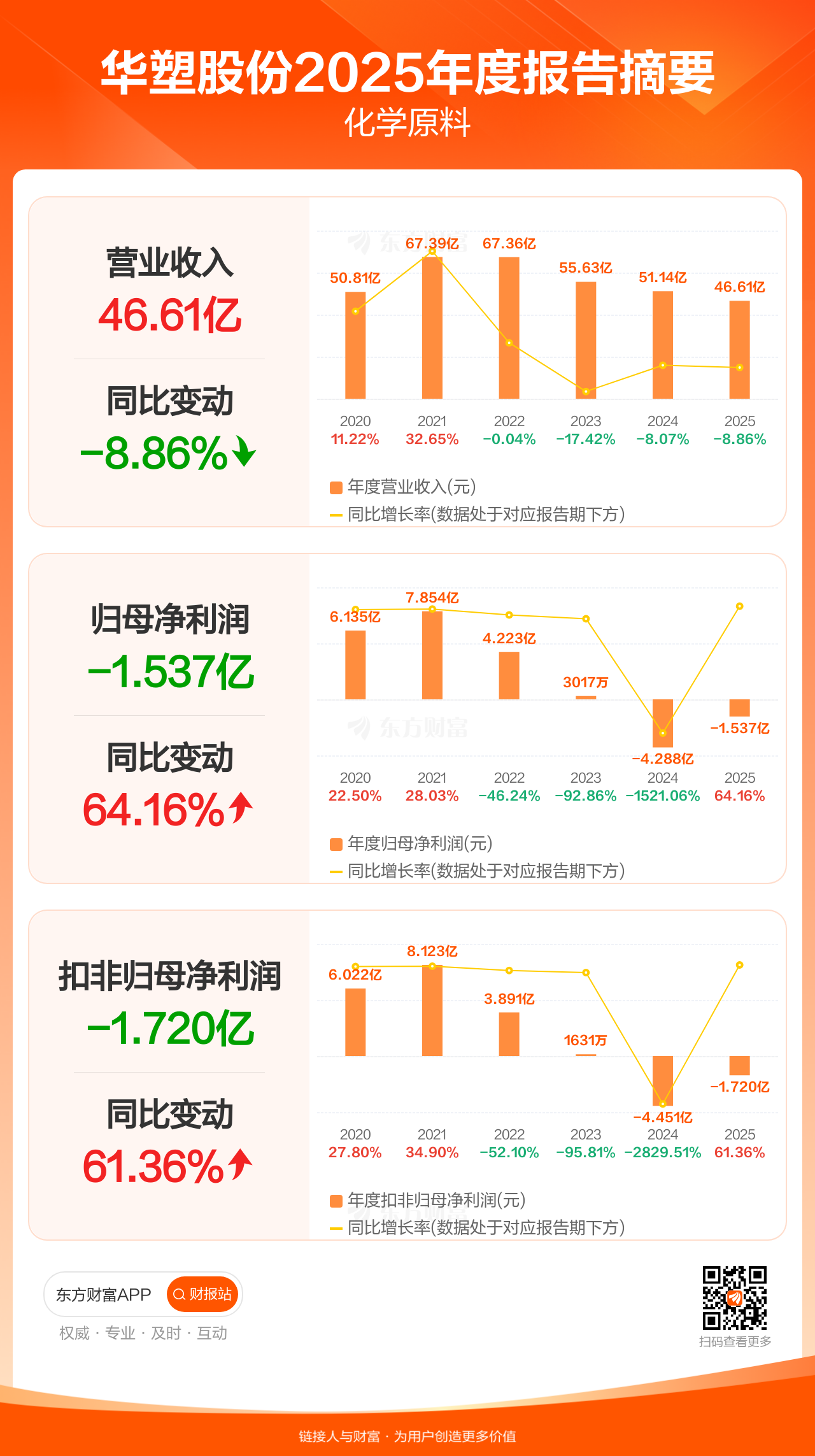 华塑股份4月16日发布2025年年报显示,公司全年实现营业收入46.61亿元,同比下滑8.86%;归母净利润-1.54亿元;扣非归母净利润-1.72亿元。