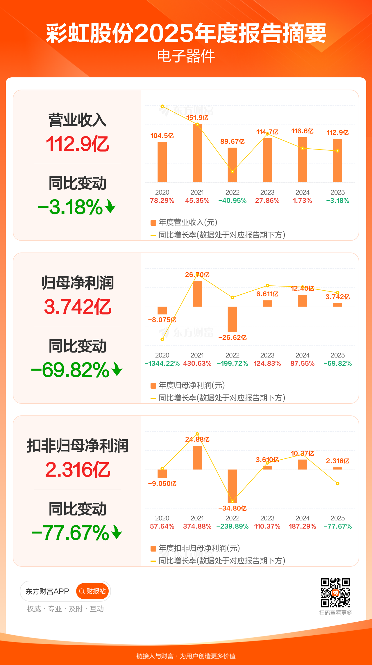 彩虹股份4月16日发布2025年年报显示,公司全年实现营业收入112.93亿元,同比下滑3.18%;归母净利润3.74亿元,同比下滑69.82%;扣非归母净利润2.32亿元,同比下滑77.67%。