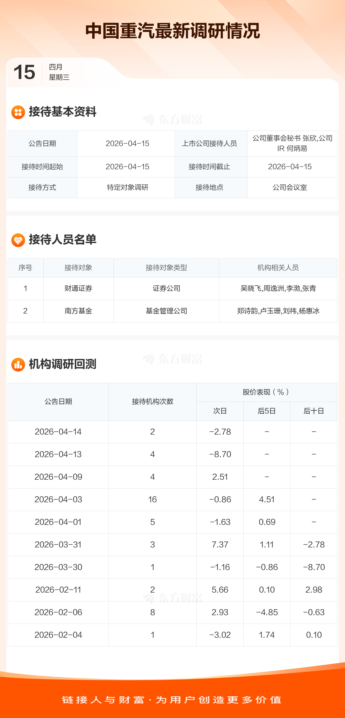 中国重汽4月15日公告称,4月15日接待财通证券等2家机构调研。接待人员包括公司董事会秘书 张欣,公司IR 何炳易。
