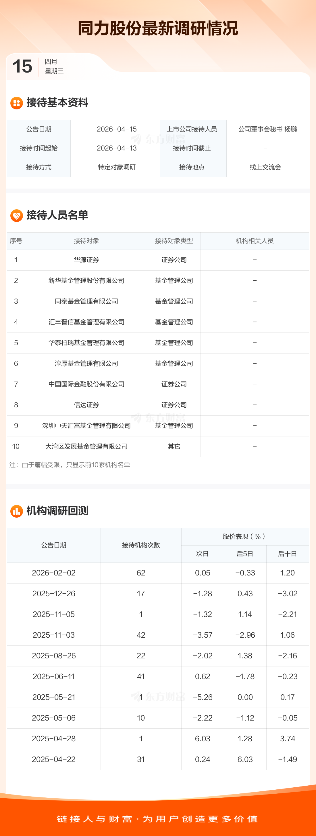 同力股份4月15日公告称,4月13日接待华源证券等66家机构调研。接待人员包括公司董事会秘书 杨鹏。