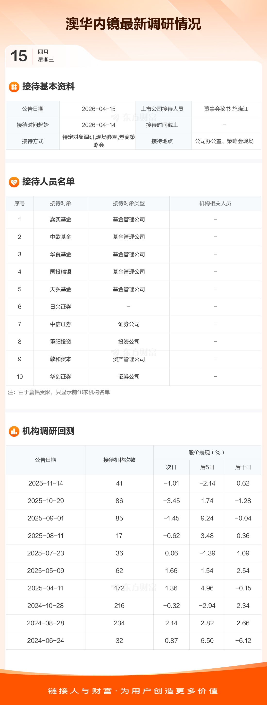 澳华内镜4月15日公告称,4月14日接待嘉实基金等27家机构调研。接待人员包括董事会秘书 施晓江。