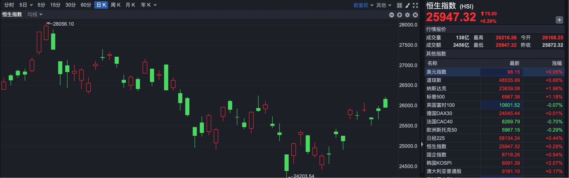 截至收盘,恒生指数报25947.32点,上涨75点,涨幅0.29%。