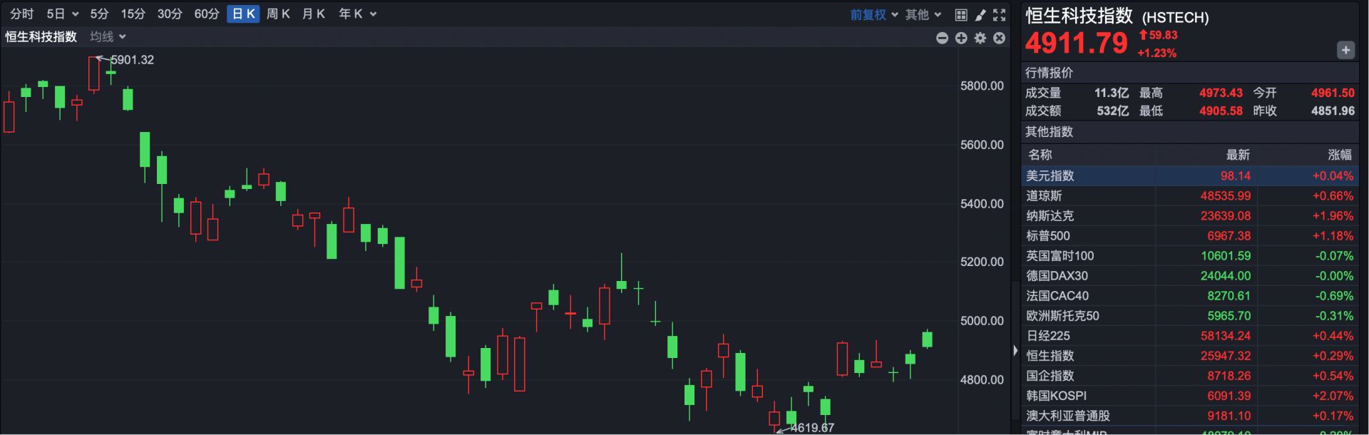 恒生科技指数收盘报4911.79点,上涨59.83点,涨幅1.23%。