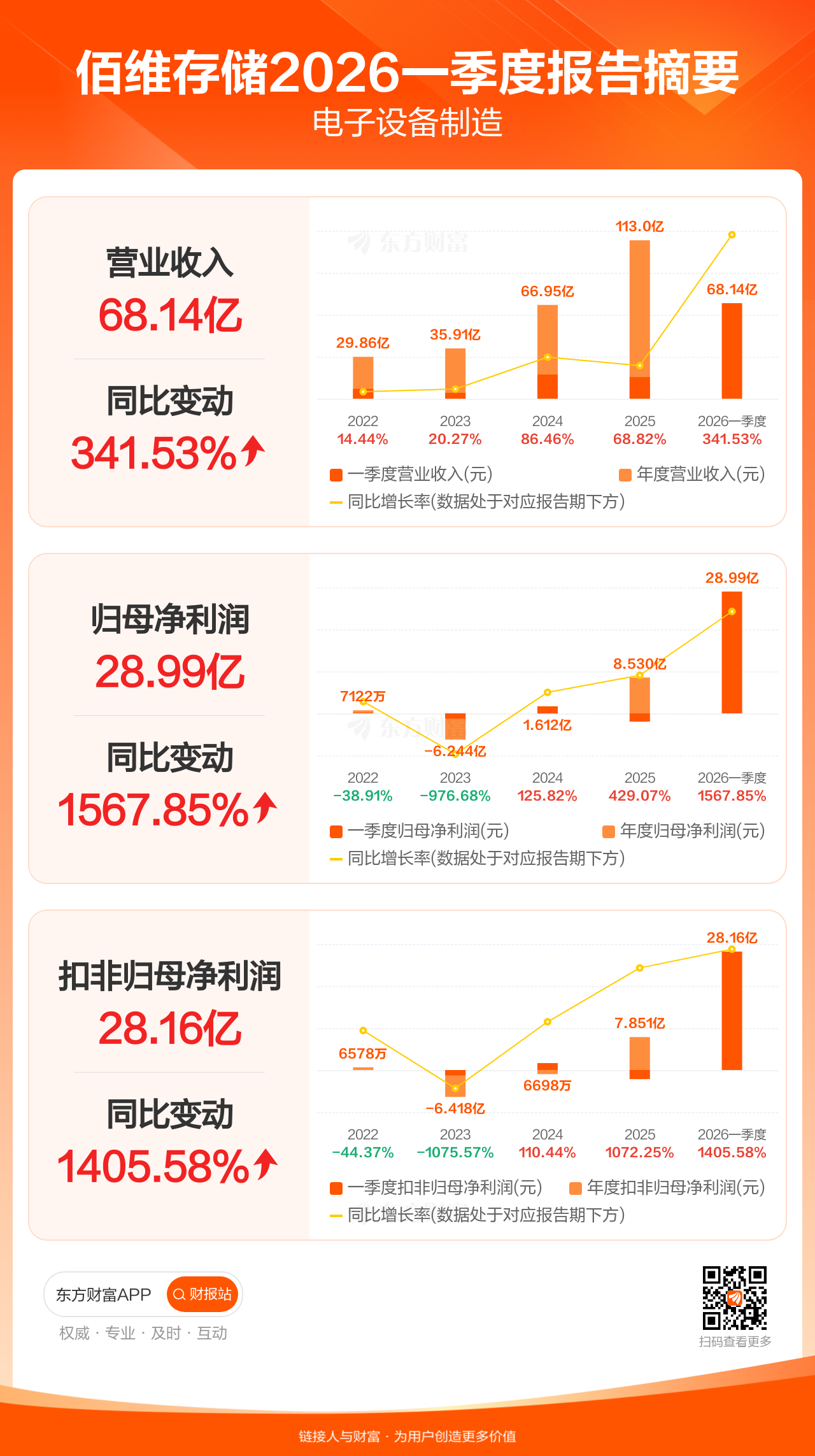 佰维存储4月16日发布2026年一季报显示,公司一季度实现营业收入68.14亿元,同比增长341.53%;归母净利润28.99亿元,同比增长1567.85%;扣非归母净利润28.16亿元,同比增长1405.58%。