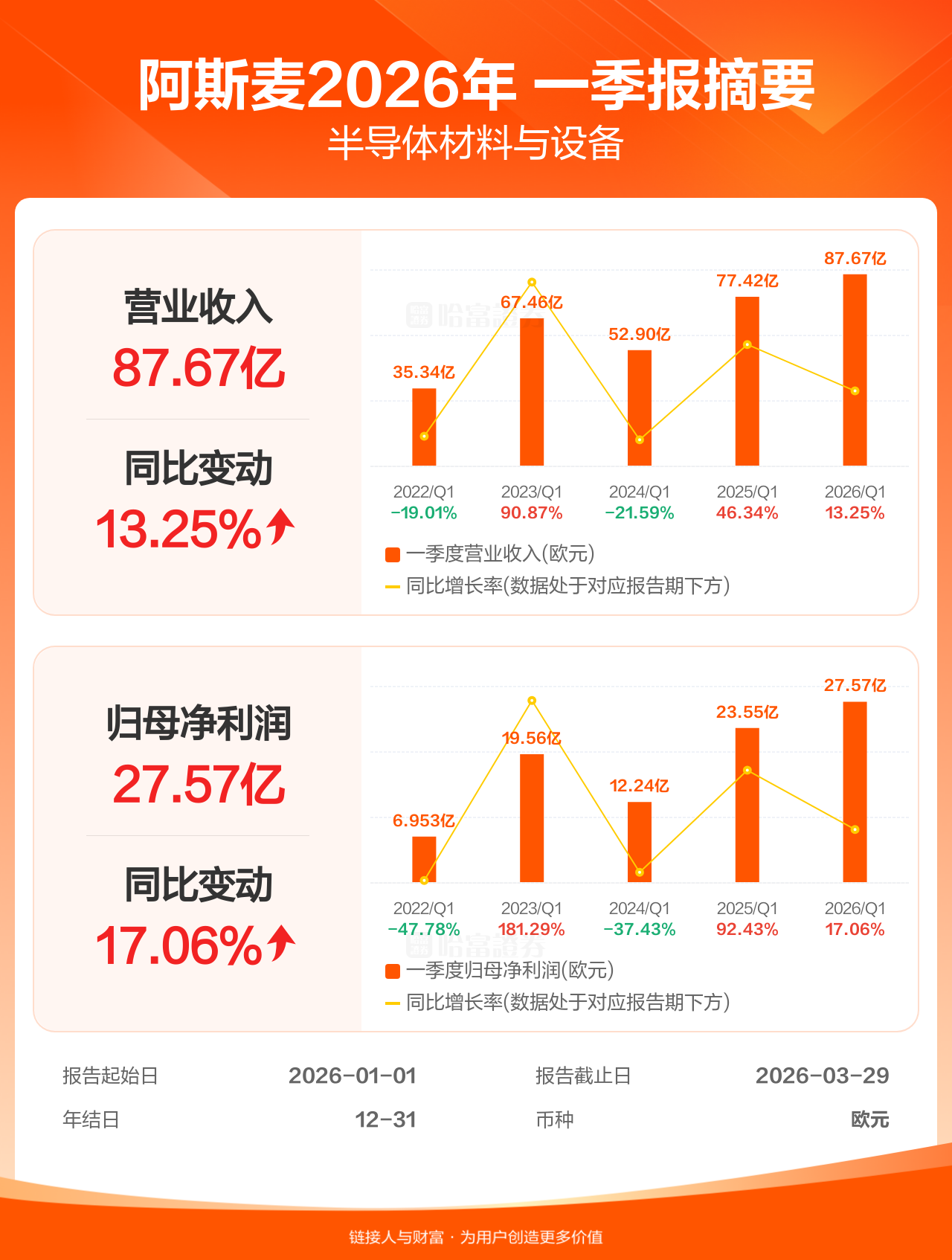 阿斯麦4月15日发布一季报业绩,截至2026年3月29日的3个月内,该公司营业收入87.67亿欧元,同比增长13.25%;公司权益持有人应占溢利(归母净利润)27.57亿欧元,同比增长17.06%。