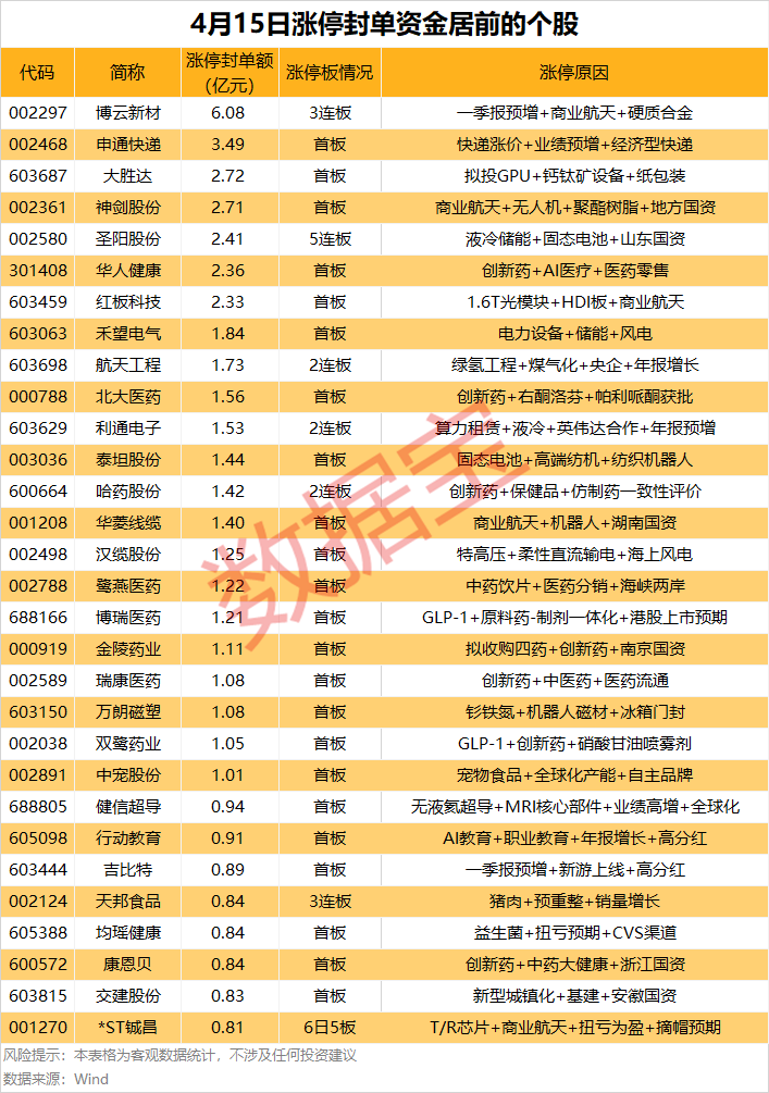从封单力度(封单量占流通A股比例)来看,博云新材、红板科技、北大医药等力度较大,分别为7.26%、4.32%、3.86%。