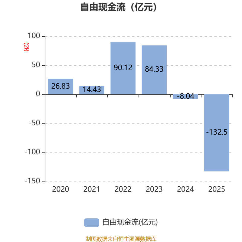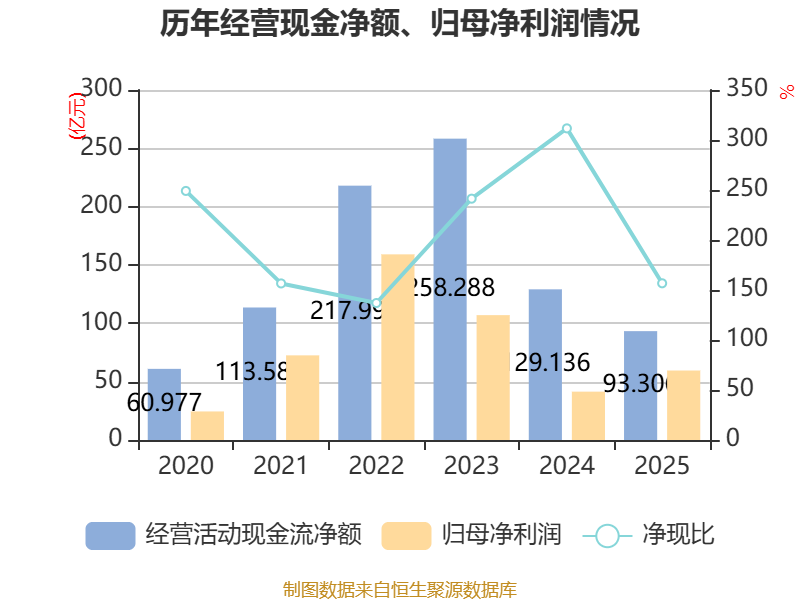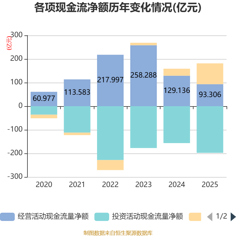 截至2025年,公司经营活动现金流净额为93.31亿元,同比下降27.75%;筹资活动现金流净额88.19亿元,同比增加58.46亿元;投资活动现金流净额-197.58亿元,上年同期为-156.35亿元。