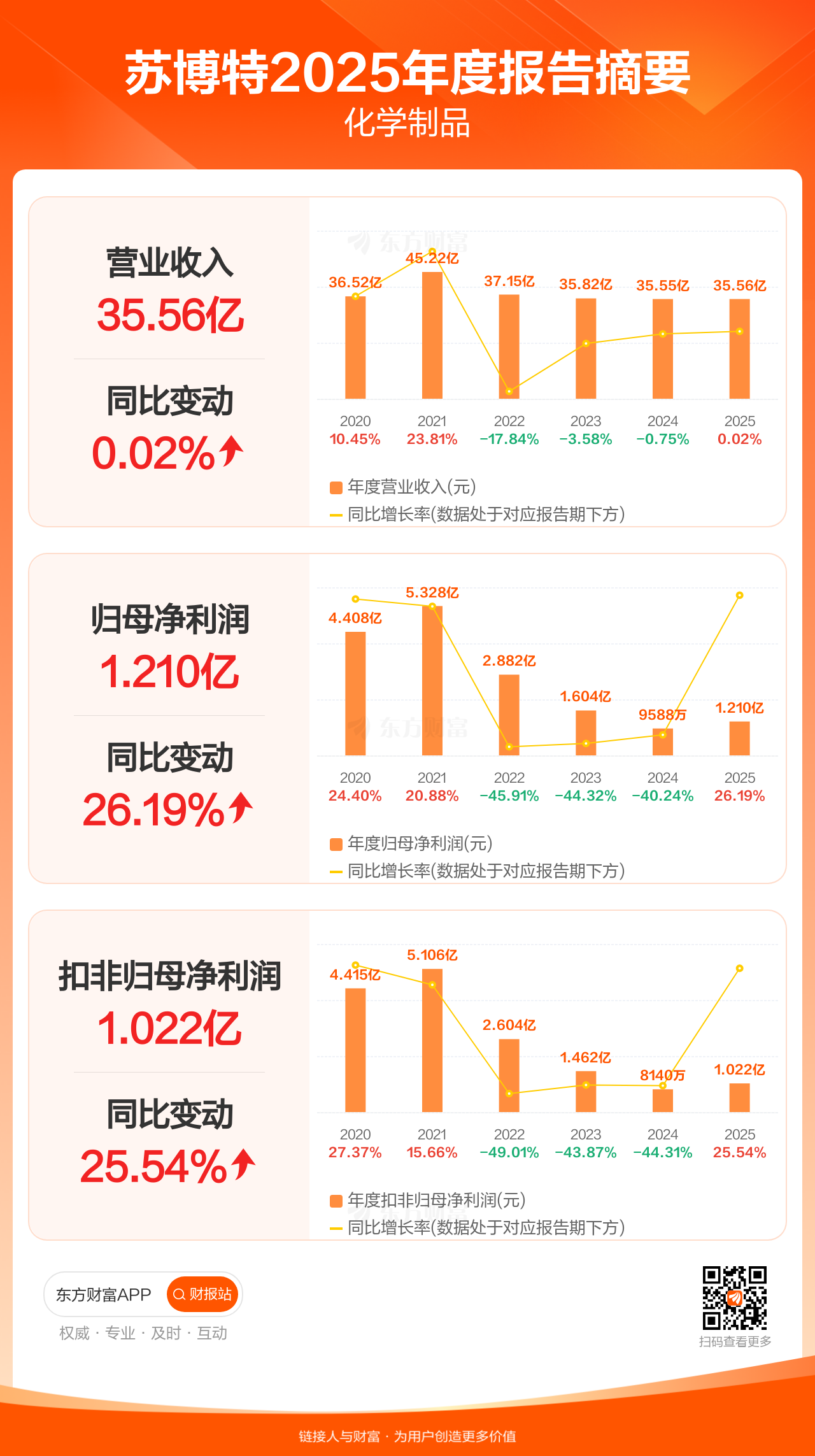 苏博特4月16日发布2025年年报显示,公司全年实现营业收入35.56亿元,同比增长0.02%;归母净利润1.21亿元,同比增长26.19%;扣非归母净利润1.02亿元,同比增长25.54%。