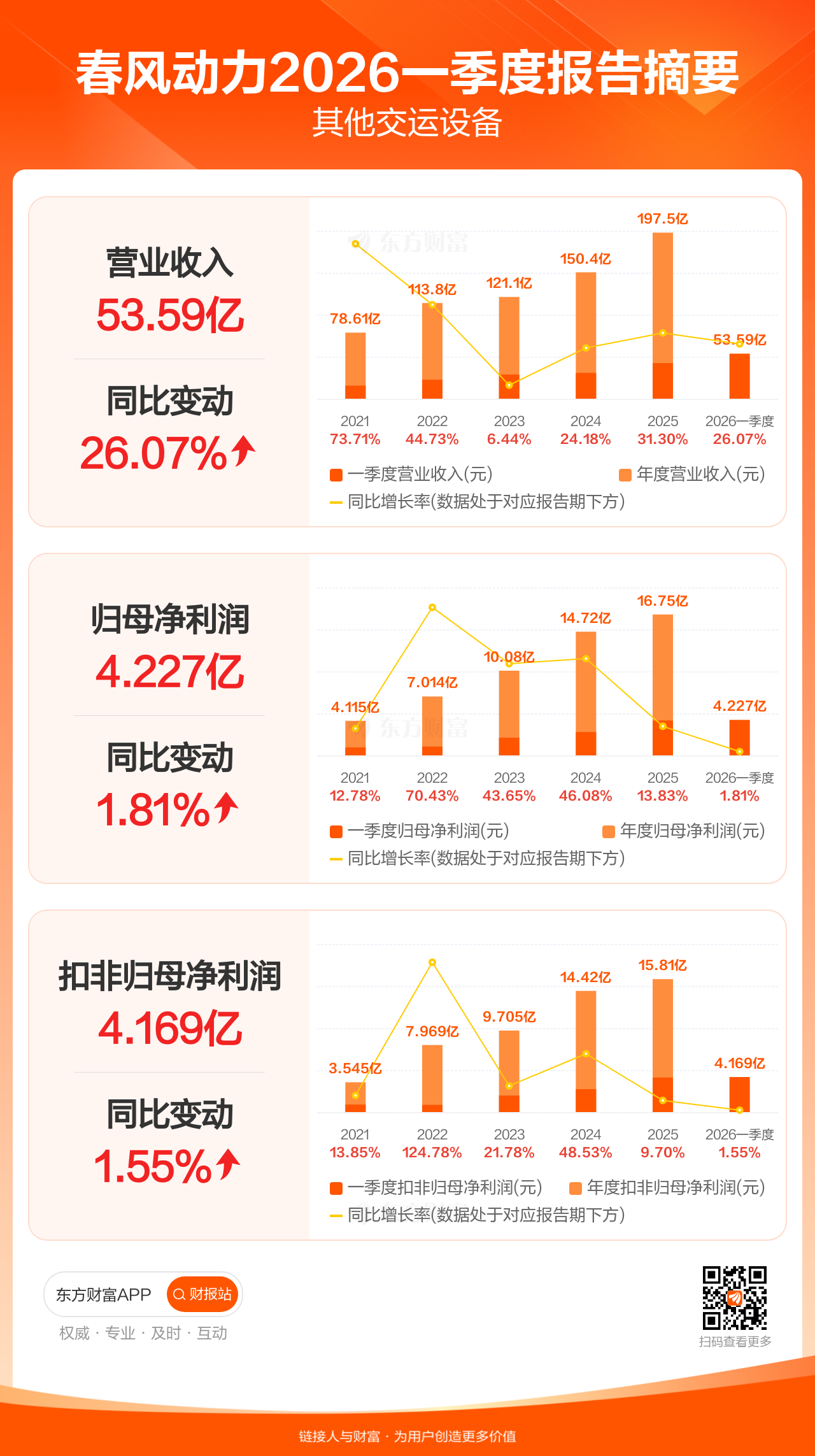 春风动力4月16日发布2026年一季报显示,公司一季度实现营业收入53.59亿元,同比增长26.07%;归母净利润4.23亿元,同比增长1.81%;扣非归母净利润4.17亿元,同比增长1.55%。