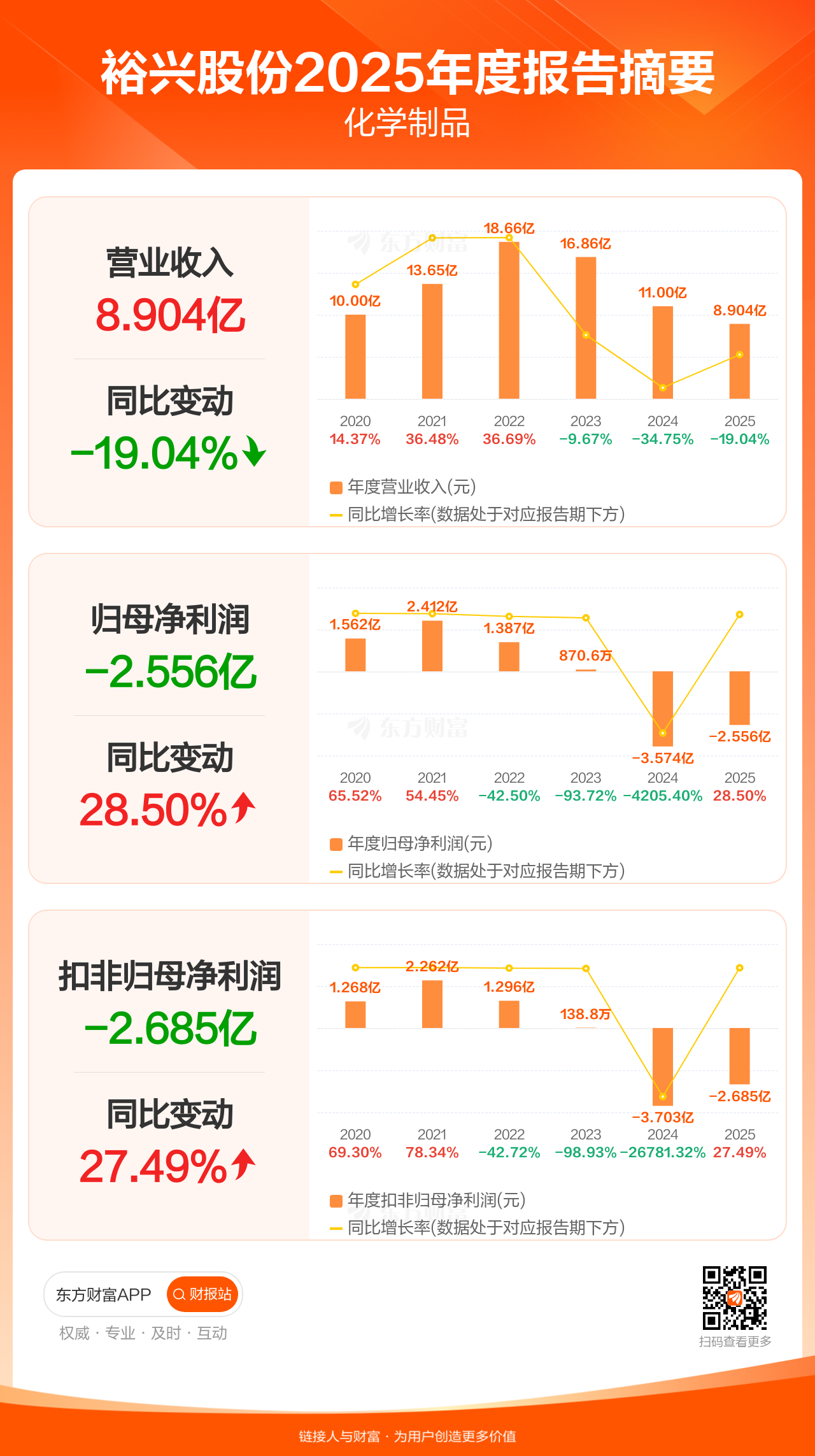 裕兴股份4月16日发布2025年年报显示,公司全年实现营业收入8.90亿元,同比下滑19.04%;归母净利润-2.56亿元;扣非归母净利润-2.68亿元。