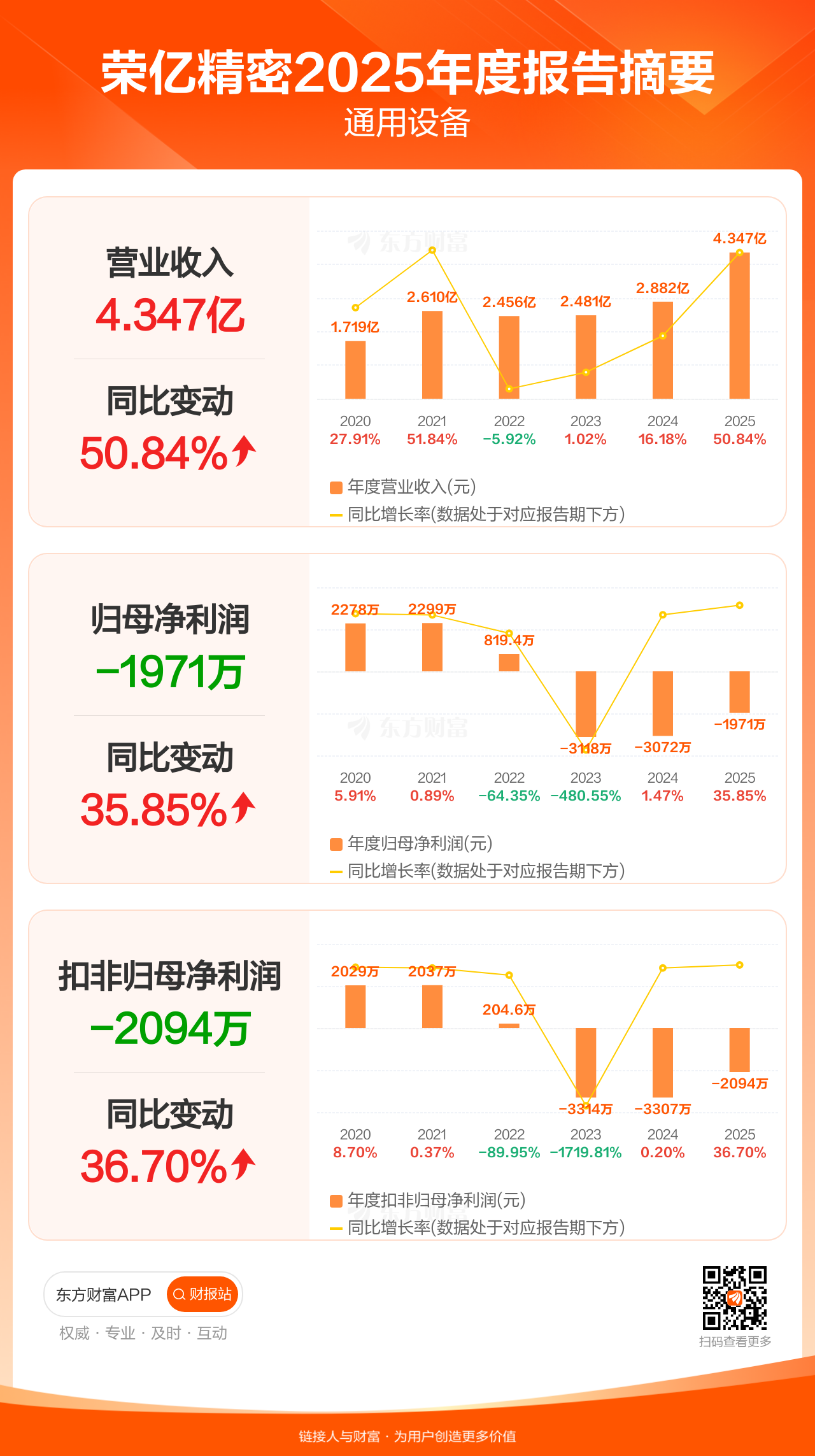 荣亿精密4月15日发布2025年年报显示,公司全年实现营业收入4.35亿元,同比增长50.84%;归母净利润-1970.90万元;扣非归母净利润-2093.57万元。