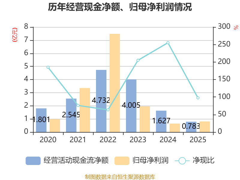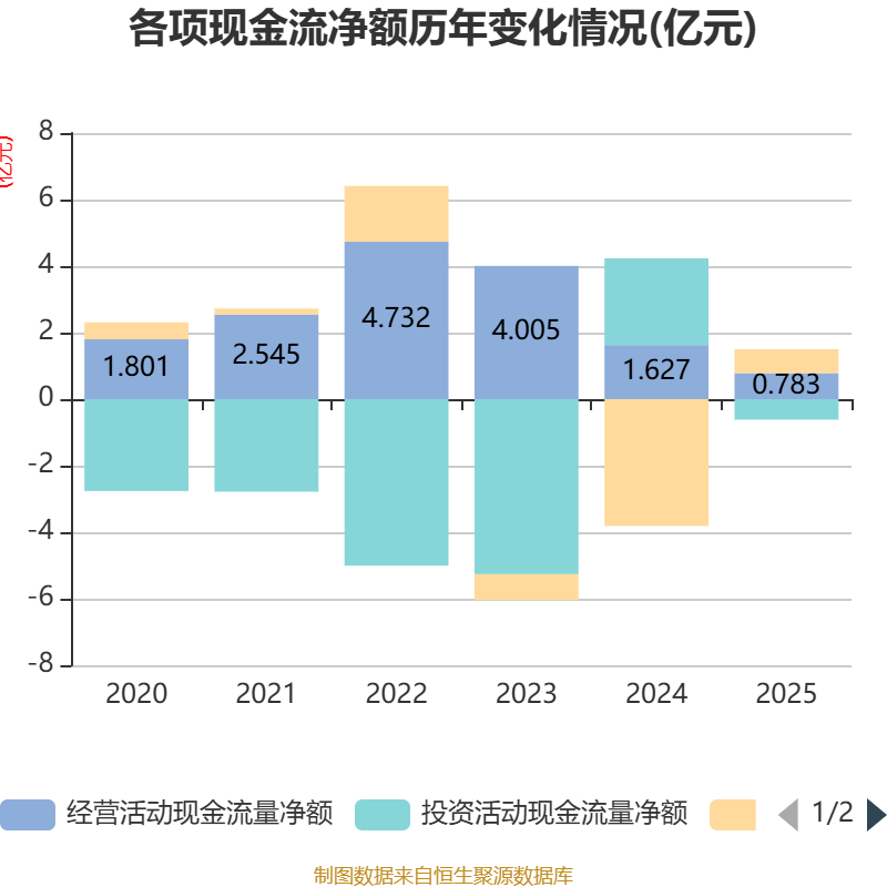 截至2025年,公司经营活动现金流净额为7827.95万元,同比下降51.88%;筹资活动现金流净额7185万元,同比增加4.53亿元;投资活动现金流净额-6155.4万元,上年同期为2.61亿元。