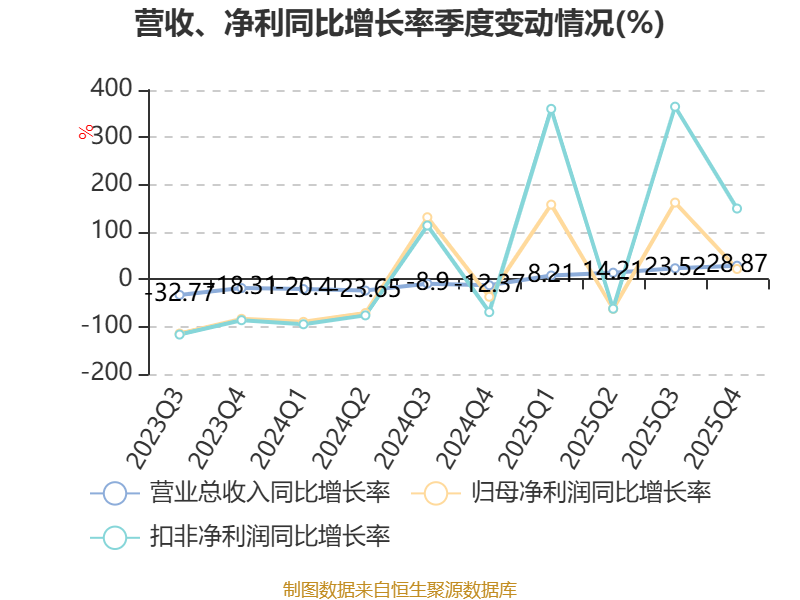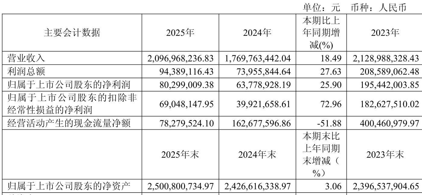 中证智能财讯三孚股份(603938)4月16日披露2025年年度报告。2025年,公司实现营业总收入20.97亿元,同比增长18.49%;归母净利润8029.90万元,同比增长25.90%;扣非净利润6904.81万元,同比增长72.96%;经营活动产生的现金流量净额为7827.95万元,同比下降51.88%;报告期内,三孚股份基本每股收益为0.21元,加权平均净资产收益率为3.26%。公司2025年度分配预案为:拟向全体股东每10股派现0.22元(含税)。