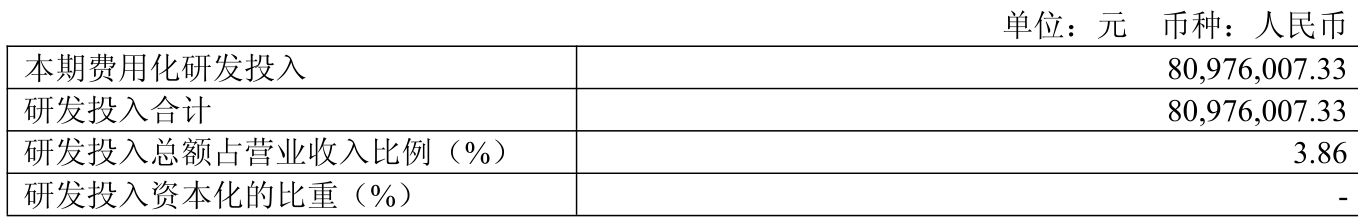 2025年全年,公司研发投入金额为8097.6万元,同比增长15.42%;研发投入占营业收入比例为3.86%,相比上年同期下降0.1个百分点。此外,公司全年研发投入资本化率为0%。