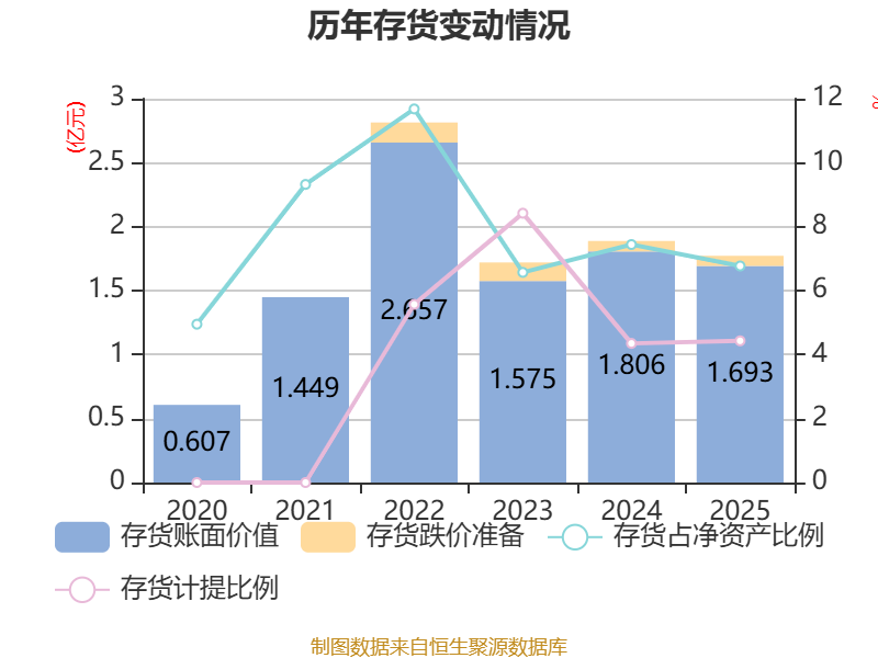 从存货变动来看,截至2025年末,公司存货账面价值为1.69亿元,占净资产的6.77%,较上年末减少1126.01万元。其中,存货跌价准备为785.11万元,计提比例为4.43%。
