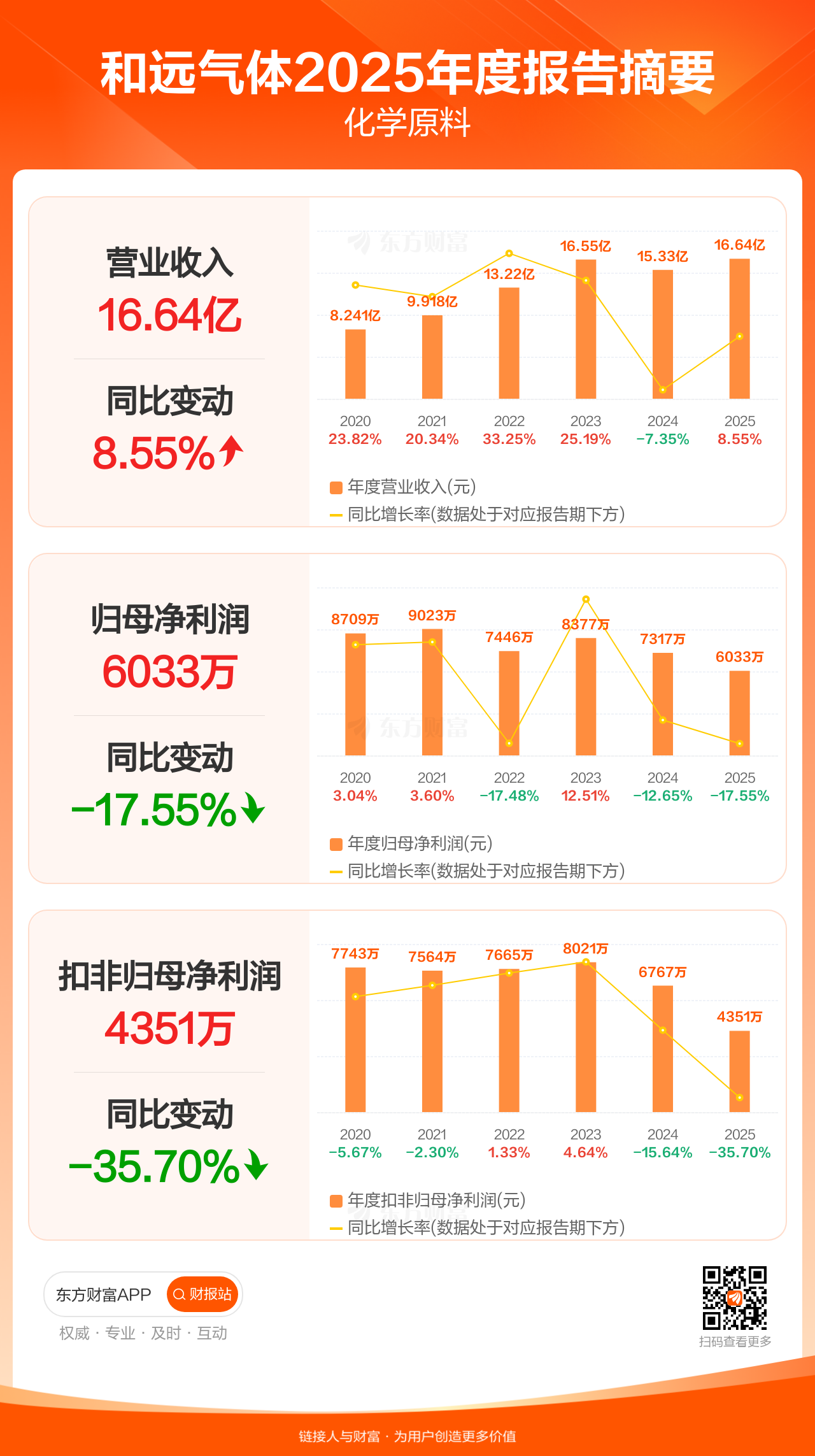 和远气体4月16日发布2025年年报显示,公司全年实现营业收入16.64亿元,同比增长8.55%;归母净利润6033.07万元,同比下滑17.55%;扣非归母净利润4350.76万元,同比下滑35.70%。