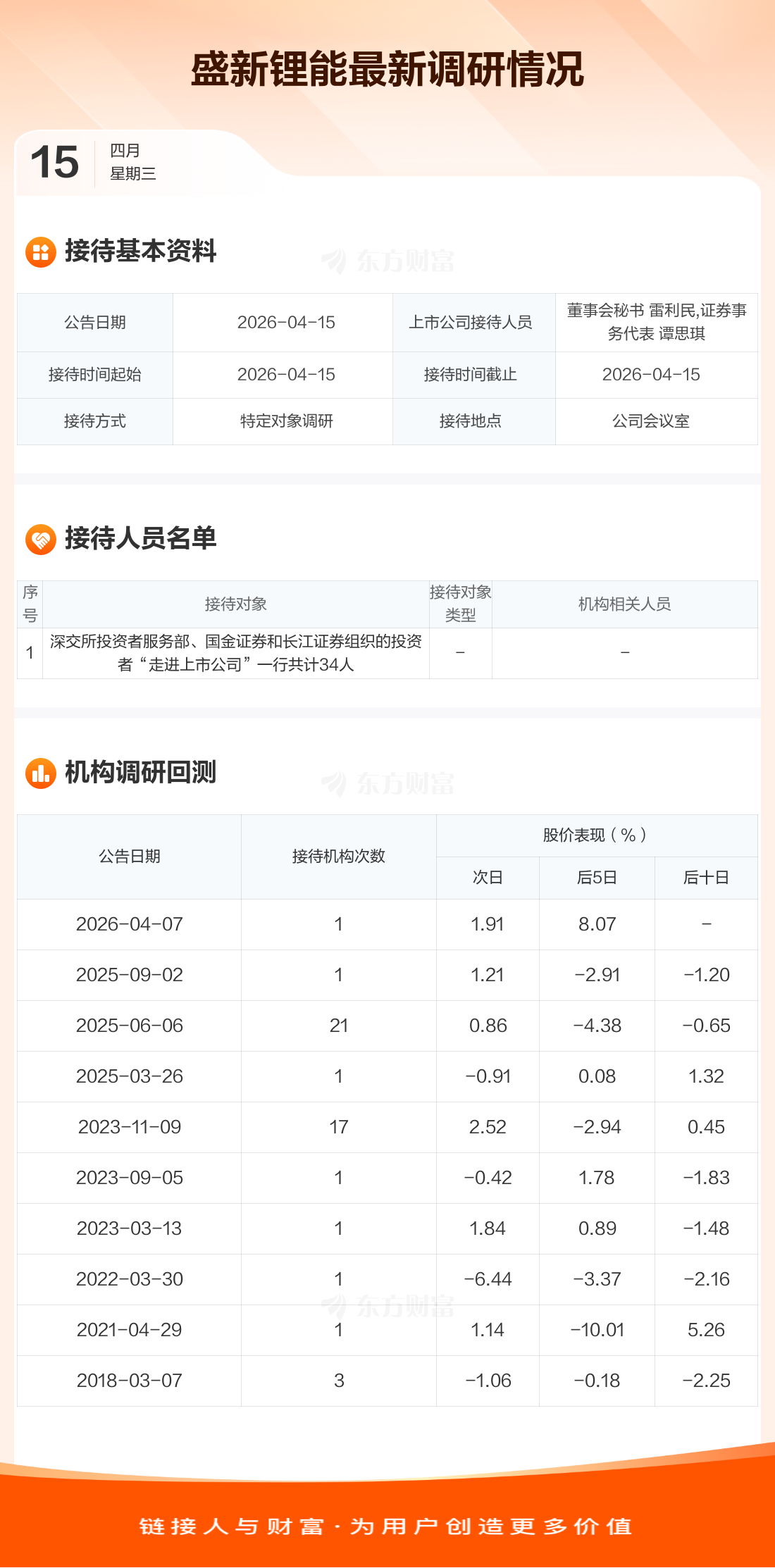 盛新锂能4月15日公告称,4月15日接待深交所投资者服务部、国金证券和长江证券组织的投资者“走进上市公司”一行共计34人调研。接待人员包括董事会秘书 雷利民,证券事务代表 谭思琪。