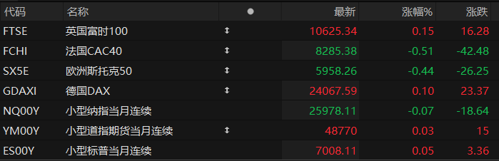 周三盘前,美股三大股指期货震荡盘整,欧洲主要指数涨跌不一。截至发稿,纳斯达克100指数期货跌0.07%,道指期货涨0.03%,标普500指数期货涨0.05%。