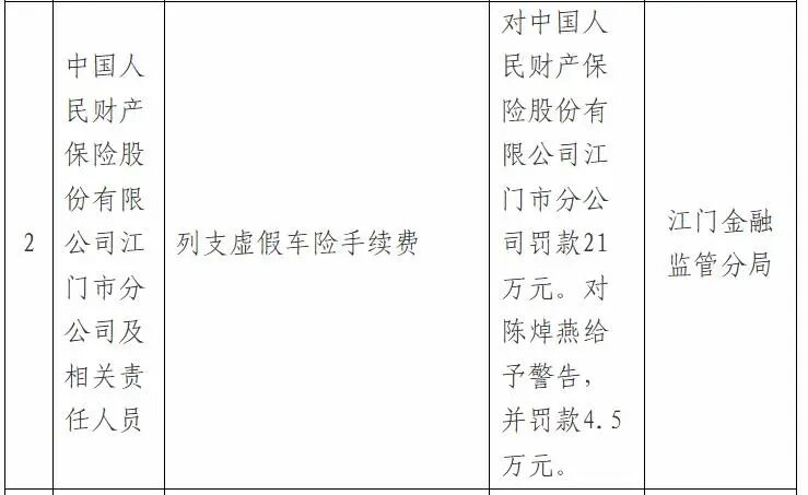 4月15日,国家金融监督管理总局江门金融监管分局公布行政处罚信息显示,中国人民财产保险股份有限公司(下称:人保财险)江门市分公司因存在“列支虚假车险手续费”的违法违规行为,被处以罚款21万元。同时,对相关责任人员陈焯燕给予警告并处罚款4.5万元。