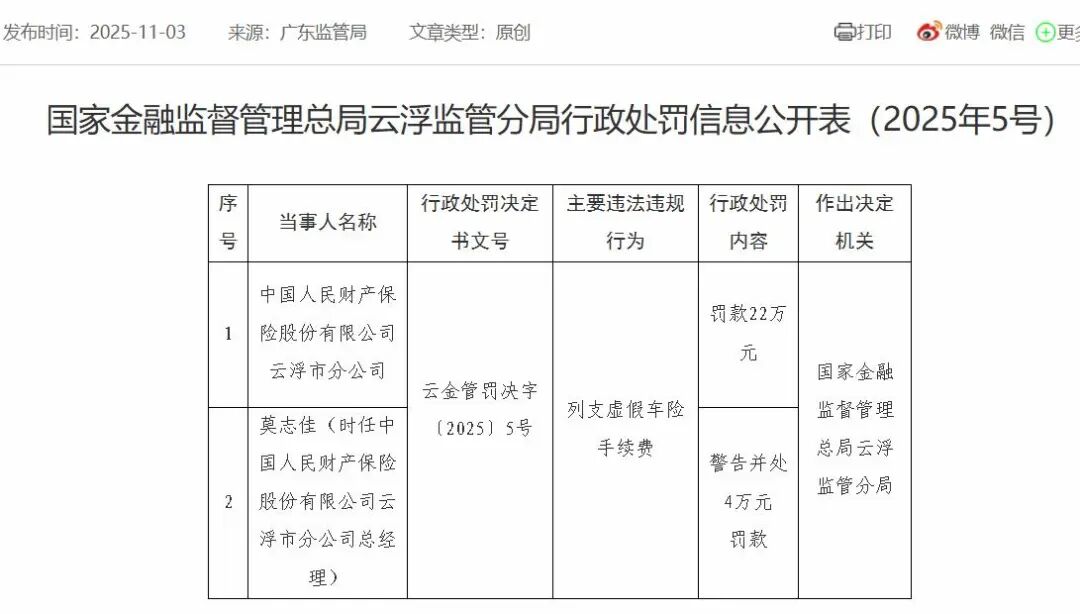 值得注意的是,这已是短期内人保财险旗下分公司第二次因同样事由受到监管处罚。2025年11月3日,中国人民财产保险股份有限公司云浮市分公司也因“列支虚假车险手续费”,被根据国家金融监督管理总局云浮监管分局罚款22万元,时任该分公司总经理莫志佳被给予警告并处罚款4万元。