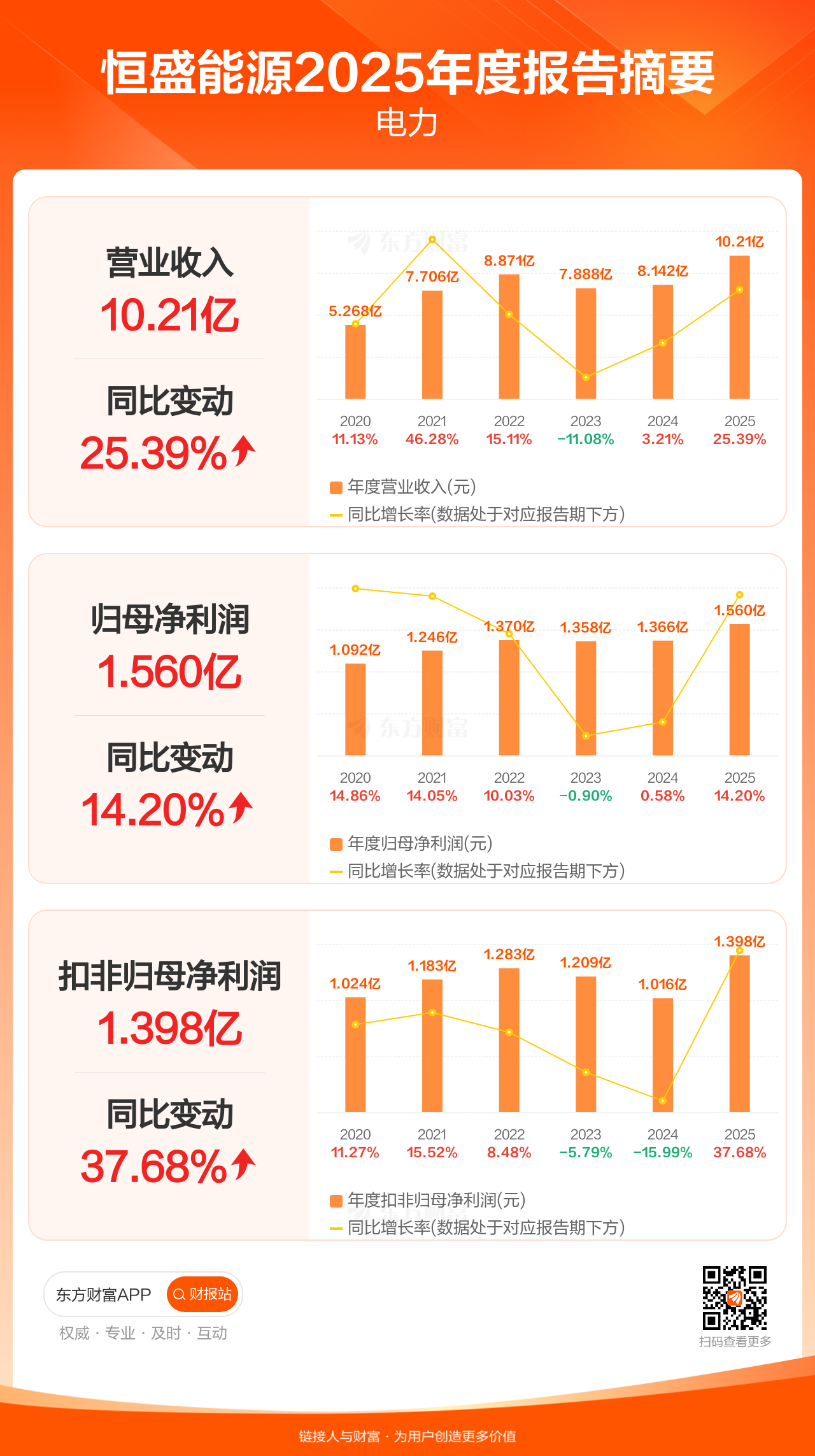 恒盛能源4月16日发布2025年年报显示,公司全年实现营业收入10.21亿元,同比增长25.39%;归母净利润1.56亿元,同比增长14.20%;扣非归母净利润1.40亿元,同比增长37.68%。