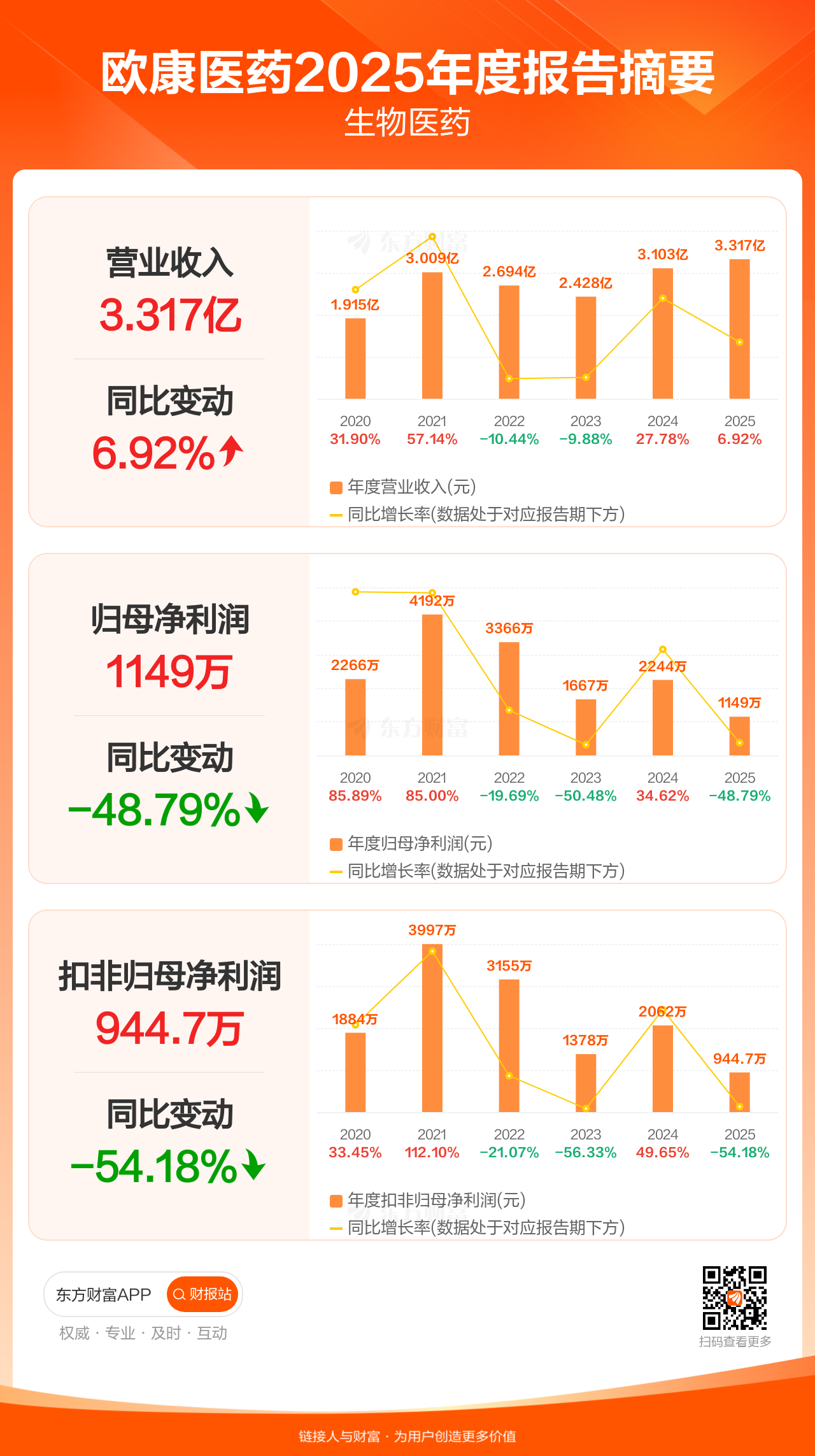 欧康医药4月15日发布2025年年报显示,公司全年实现营业收入3.32亿元,同比增长6.92%;归母净利润1149.33万元,同比下滑48.79%;扣非归母净利润944.67万元,同比下滑54.18%。