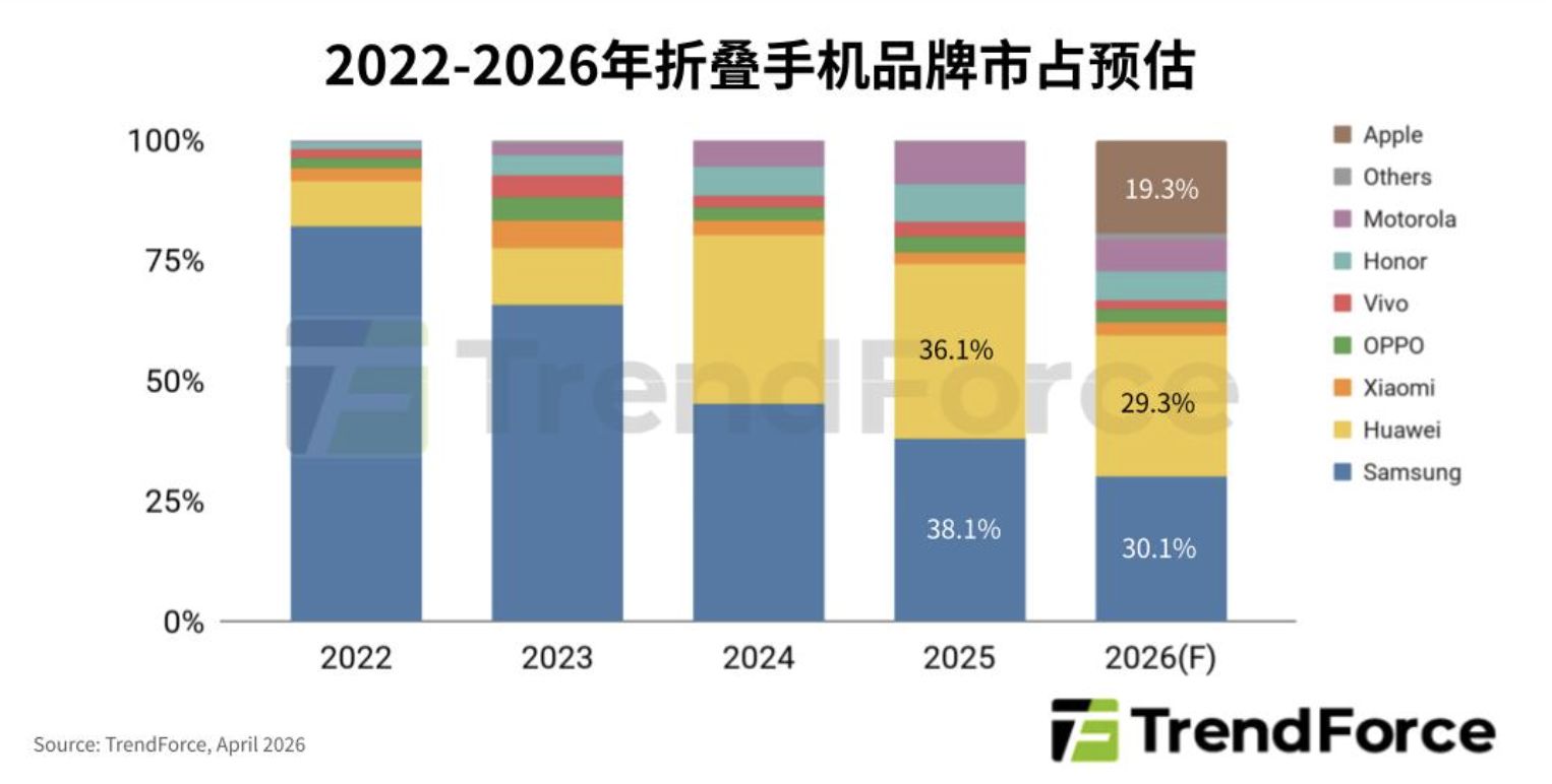 消息面上,TrendForce集邦咨询近日发布的最新显示产业研究预估,苹果将于2026年取得折叠手机市场近20%的市场占有率,并将三星、华为的占比压缩至30%上下。