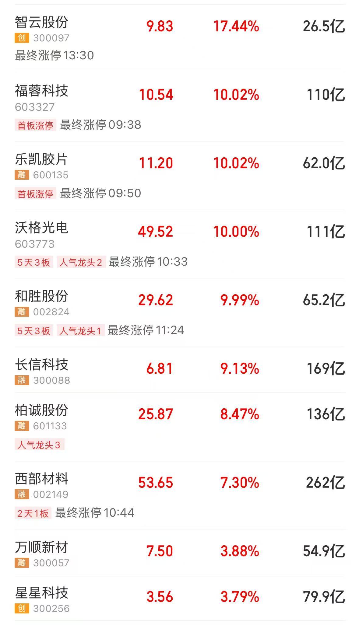 4月15日,折叠屏概念股走强,福蓉科技(SH603327,股价10.54元,市值110.2亿元)涨停,长信科技(SZ300088,股价6.81元,市值170.1亿元)、万顺新材(SZ300057,股价7.5元,市值67.86亿元)、安洁科技(SZ002635,股价15.85元,市值104.6亿元)等冲高。