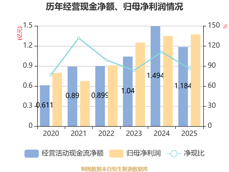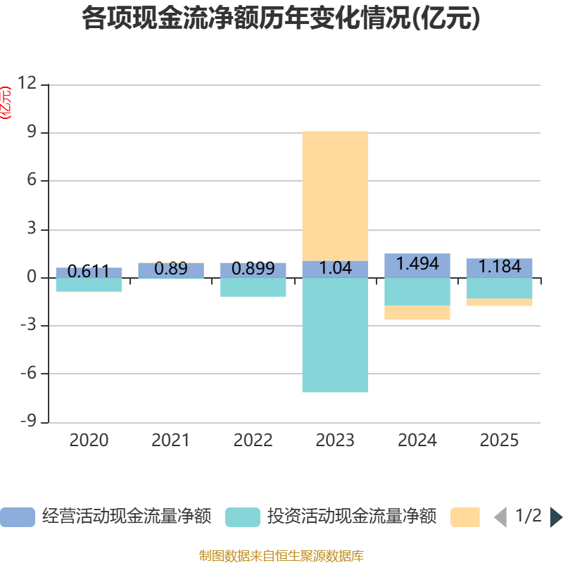 截至2025年,公司经营活动现金流净额为1.18亿元,同比下降20.77%;筹资活动现金流净额-4453.82万元,同比增加4252.69万元;投资活动现金流净额-1.32亿元,上年同期为-1.75亿元。