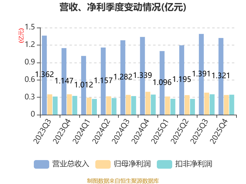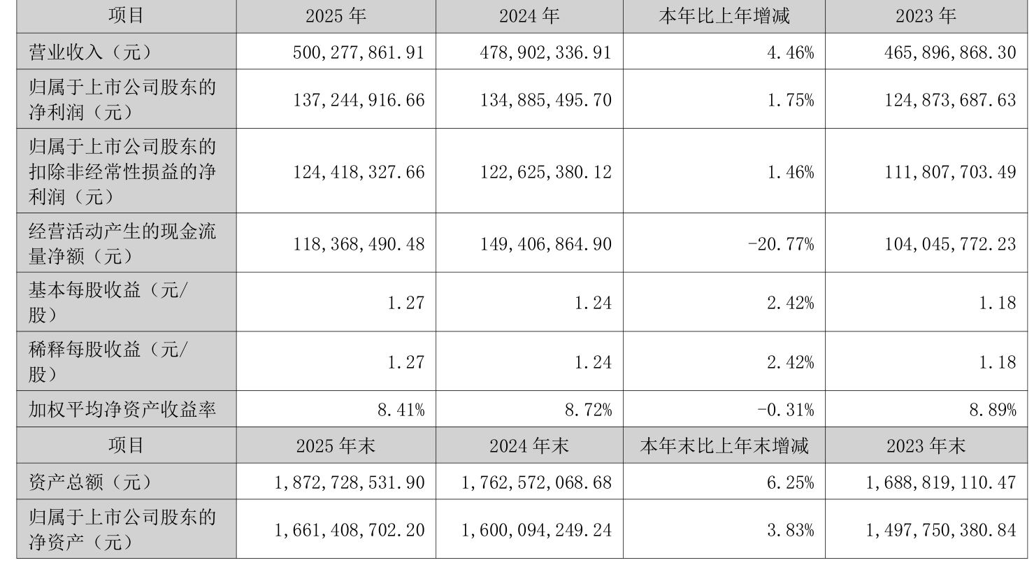中证智能财讯凌玮科技(301373)4月16日披露2025年年度报告。2025年,公司实现营业总收入5亿元,同比增长4.46%;归母净利润1.37亿元,同比增长1.75%;扣非净利润1.24亿元,同比增长1.46%;经营活动产生的现金流量净额为1.18亿元,同比下降20.77%;报告期内,凌玮科技基本每股收益为1.27元,加权平均净资产收益率为8.41%。公司2025年度分配预案为:拟向全体股东每10股派现3元(含税)。