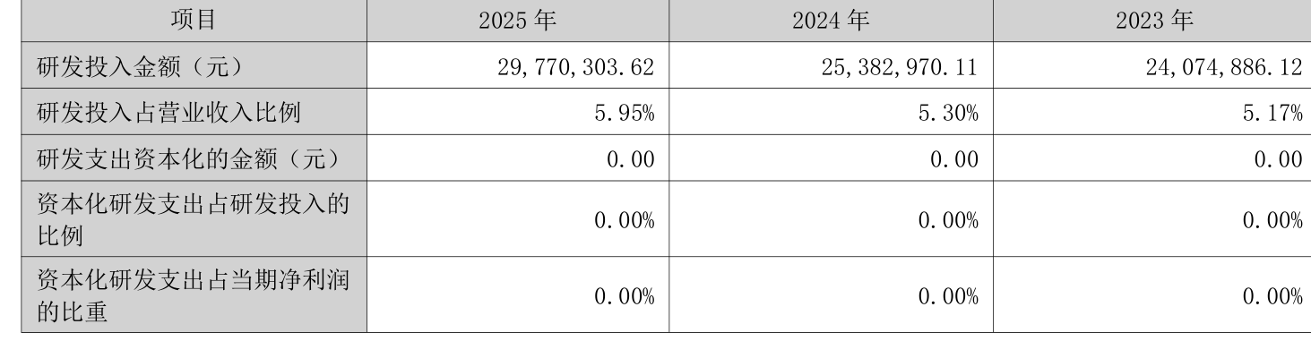 2025年全年,公司研发投入金额为2977.03万元,同比增长17.28%;研发投入占营业收入比例为5.95%,相比上年同期上升0.65个百分点。此外,公司全年研发投入资本化率为0%。