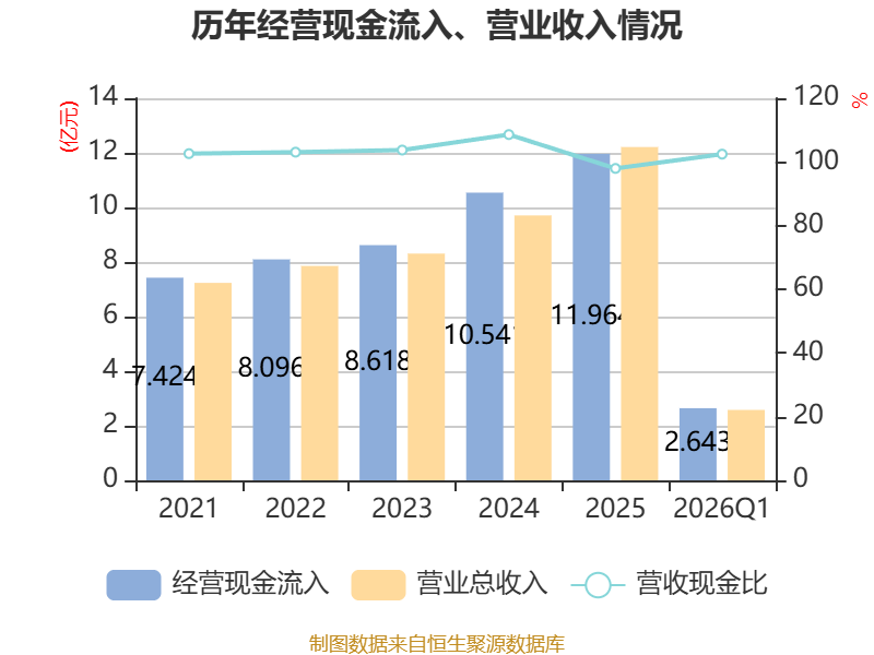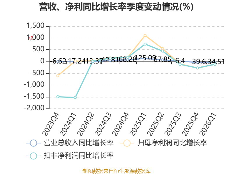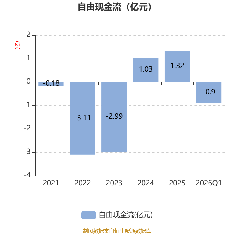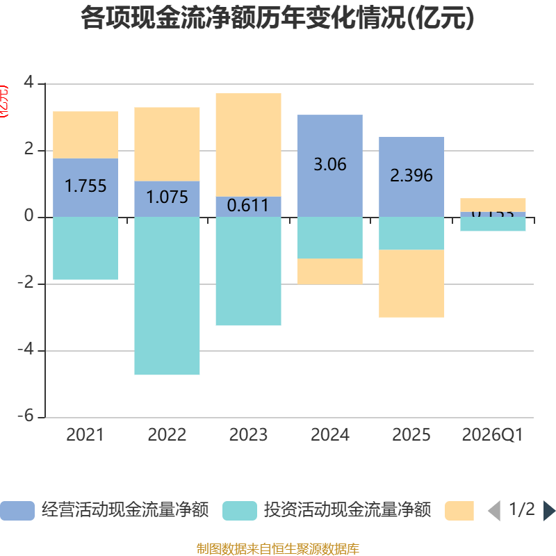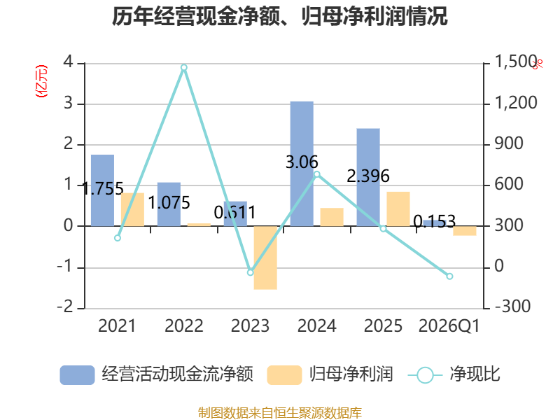 截至2026年一季度末,公司经营活动现金流净额为1529.3万元,同比下降86.69%;筹资活动现金流净额4060.33万元,同比增加1.14亿元;投资活动现金流净额-4251.91万元,上年同期为-2268.04万元。