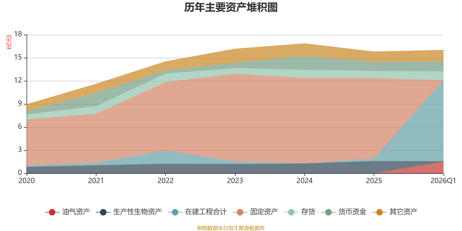 资产重大变化方面,截至2026年一季度末,公司固定资产较上年末减少100%,占公司总资产比重下降66.03个百分点;在建工程合计较上年末增加3137.91%,占公司总资产比重上升63.72个百分点;生产性生物资产较上年末减少96.35%,占公司总资产比重下降9.63个百分点;油气资产占公司总资产的9.42%,上年末为0。