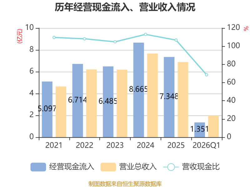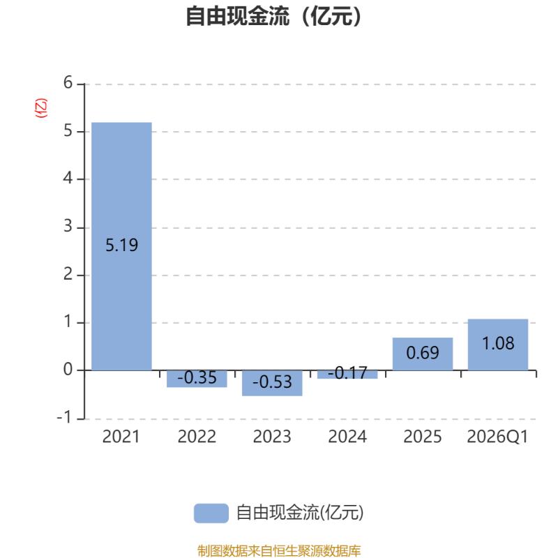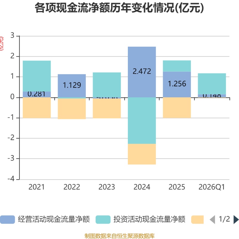 截至2026年一季度末,公司经营活动现金流净额为1480.58万元,同比增加4993.61万元;筹资活动现金流净额-220.48万元,同比减少200.94万元;投资活动现金流净额1.02亿元,上年同期为3557.23万元。