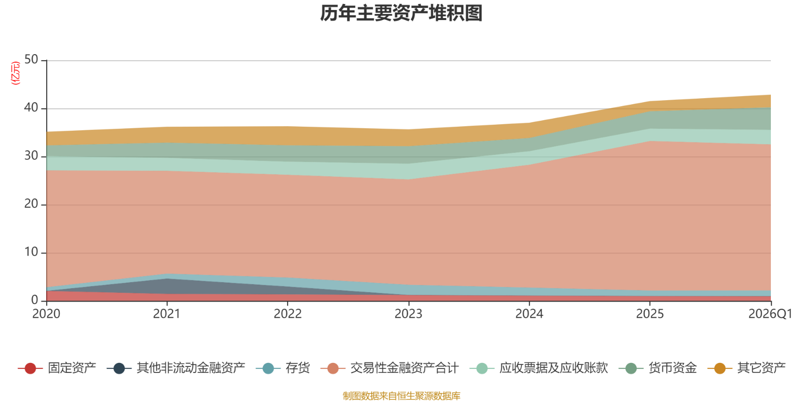 资产重大变化方面,截至2026年一季度末,公司交易性金融资产合计较上年末减少2.37%,占公司总资产比重下降4.07个百分点;货币资金较上年末增加30.19%,占公司总资产比重上升2.27个百分点;其他流动资产较上年末增加515.76%,占公司总资产比重上升1.25个百分点;应收票据及应收账款较上年末增加16.95%,占公司总资产比重上升0.83个百分点。