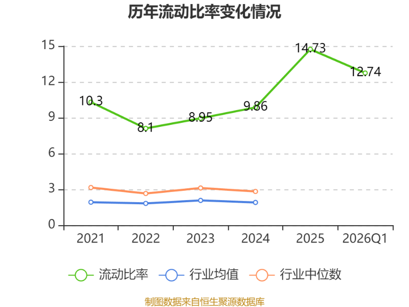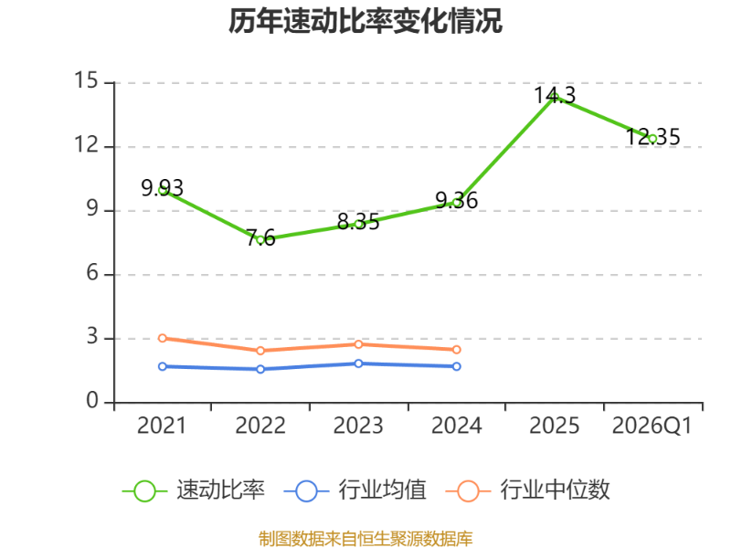 2026年第一季度,公司流动比率为12.74,速动比率为12.35。