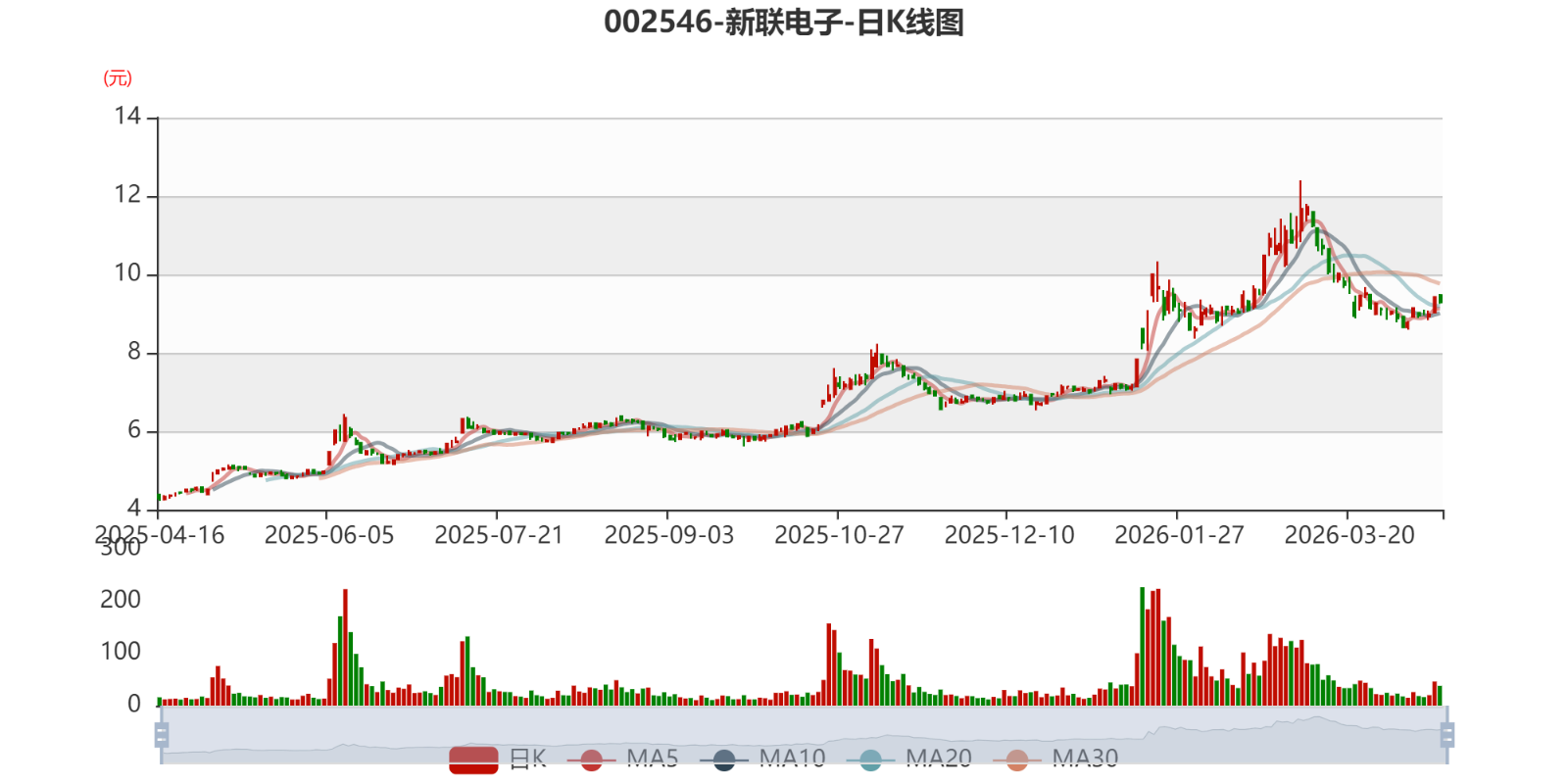 中证智能财讯新联电子(002546)4月16日披露2026年第一季度报告。公司实现营业总收入1.97亿元,同比增长11.10%;归母净利润9115.27万元,同比下降15.04%;扣非净利润4035.59万元,同比增长0.34%;经营活动产生的现金流量净额为1480.58万元,上年同期为-3513.03万元;报告期内,新联电子基本每股收益为0.11元,加权平均净资产收益率为2.37%。